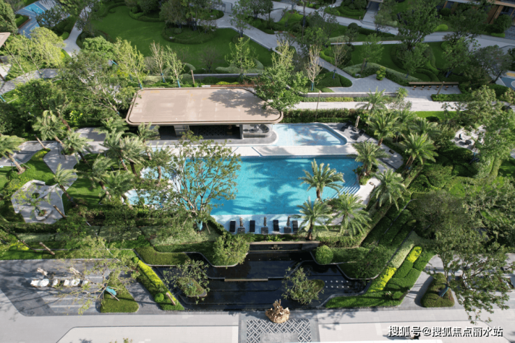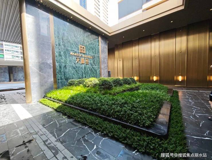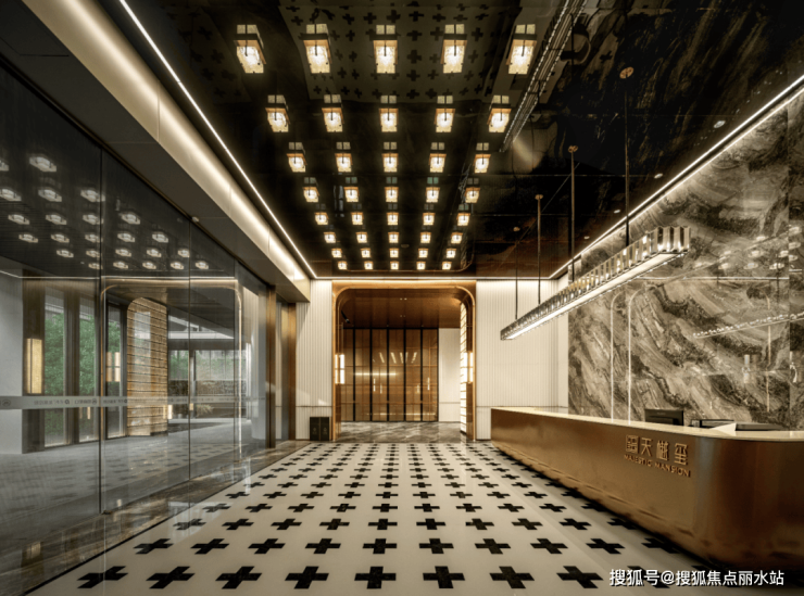 大门门头高度超6米,跨度近100米;穿过大门,便是让人眼前一亮的“宝格丽酒店风”大堂及约2000㎡下沉式庭院:吧台、泳池、高尔夫室、私宴厅、健身房……奢华配置看得人眼花缭乱。