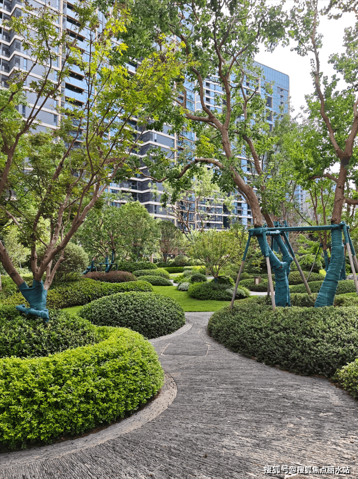 游园途中抬头看看,掩映在绿意之中,天樾玺蓝盈盈的南立面,观感还是不错的。