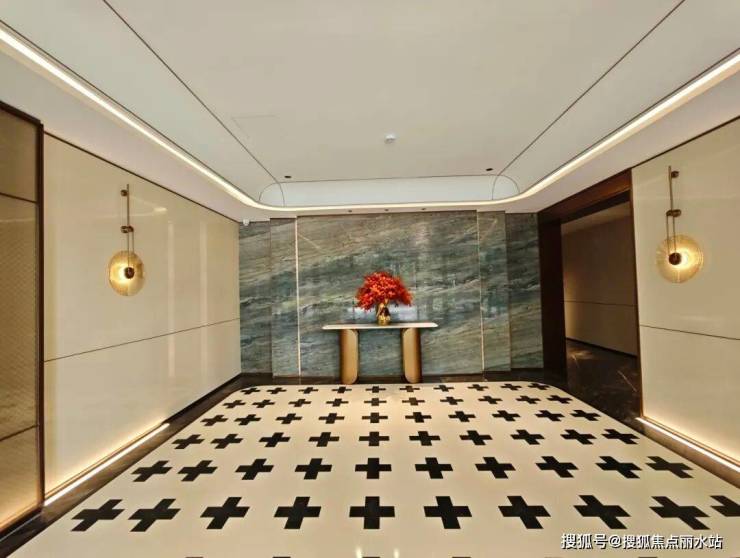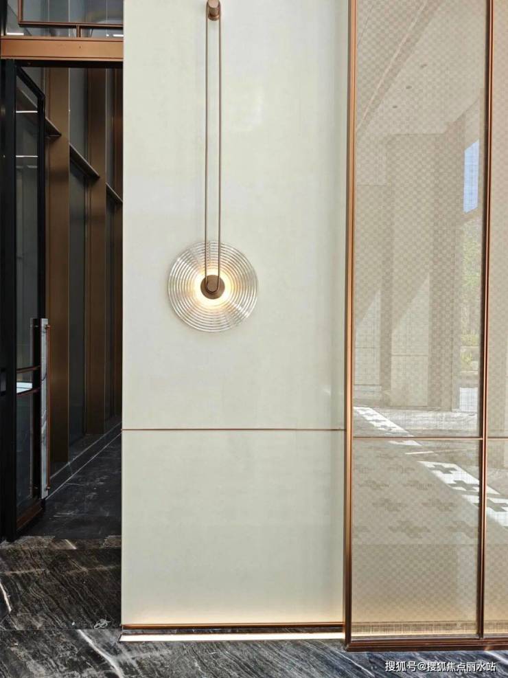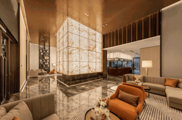 大堂内近6米的挑高与架空层相同,一进门就能看到通高的岩板,两侧竖向的壁灯及装饰面板将视线向上延伸,整体观感上相当气派。