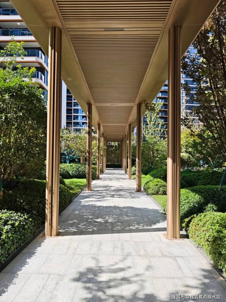大门进去后,左右两侧便是串联起整个地块楼栋的风雨连廊。这可以说是天樾玺整个园林景观中最有看点的地方:
