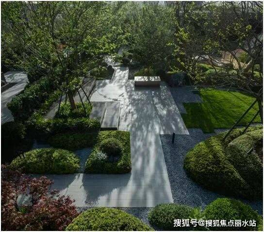 通过更密集的种植手法,让绿植在垂直面的观感上更加浓郁,放眼望去甚至有些“密不透风”,但细看下苗木选型都很普通。