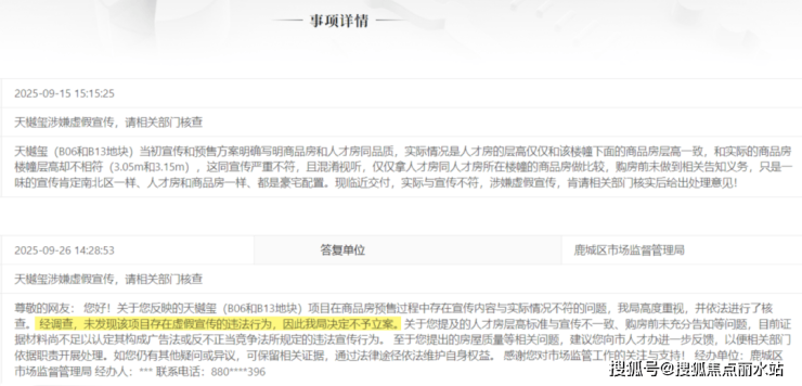 我们注意到在“民呼我为”平台、第三方自媒体上,有多个关于“天樾玺人才房虚假宣传”的投诉,涉及“层高缩水”、园林架空层减配、连廊断头、大堂缩水等问题。其中,对于层高缩水等问题,属地部门曾公开回复称“未发现存在虚假宣传的违法行为”。
