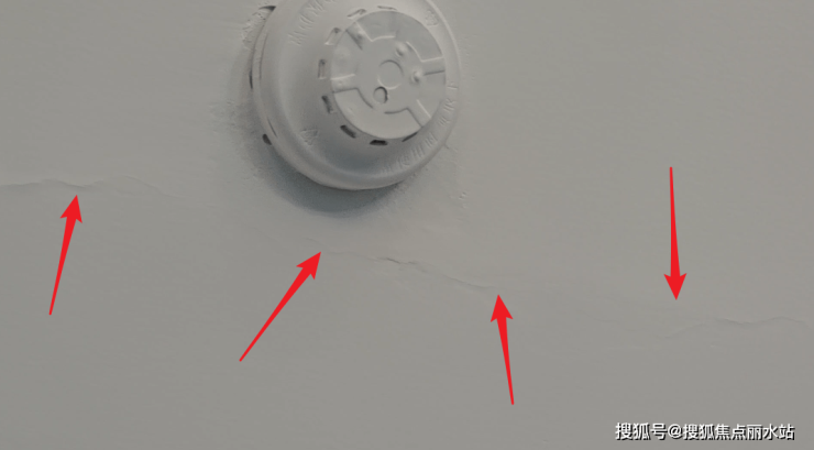 另一个是墙面开裂问题。主要集中在墙面窗洞口和楼板施工预留孔洞。比如天花板顶灯、报警器等周围,油漆有竖向的开裂且面积较大。