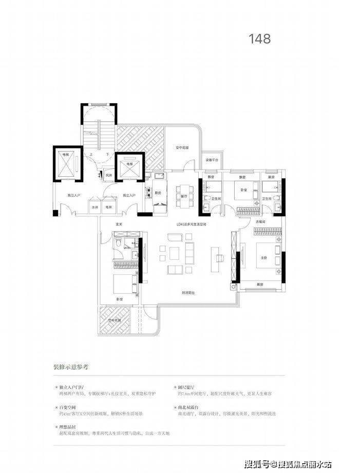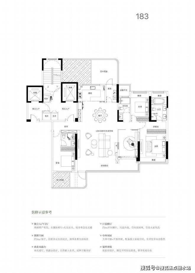 项目特色:南北双阳台为标配,每户实现50%绿植覆盖率,将原本属于低密别墅的院落空间引到空中,重新定义大平层生活方式。