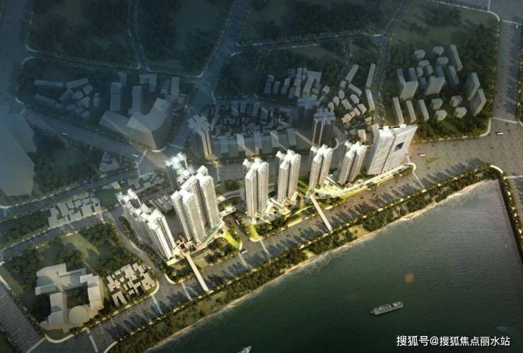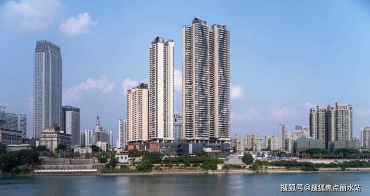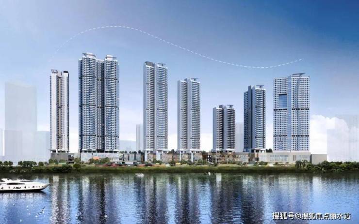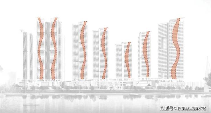布局最大化利用一线城市江景资源,沿江体量通透。楼体高低参差交错起伏营造变化律动感,以 “优雅的鲸鱼线” 呼应江流蜿蜒水韵弧线,一期为鲸鱼头部,二期作尾,悦动天边,改善沿江城市景观带的整体天际线。