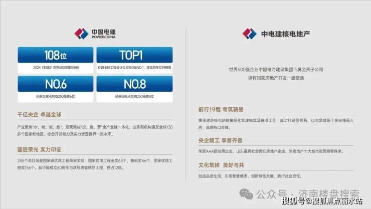 中电建核电地产,世界500强央企(2024年第108位)——中电建集团下属全资子公司,拥有国家房地产开发一级资质,深耕齐鲁19载,成功打造山水泉城系、国誉系等十余座精品人居。