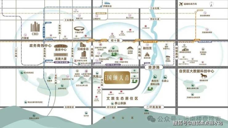 【景观配套主城旅游路 低密惟此境】:东绕城高速内,主城旅游路低密留白之地:项目西临凤凰山,南望泰山余脉,东有化盘山,北有莲花山,是主城罕见的四山环抱之地。同时项目东临韩仓河,山水浸润,环境生态宜居,土地稀缺性兼具居住舒适性,塔尖改善臻藏优选。