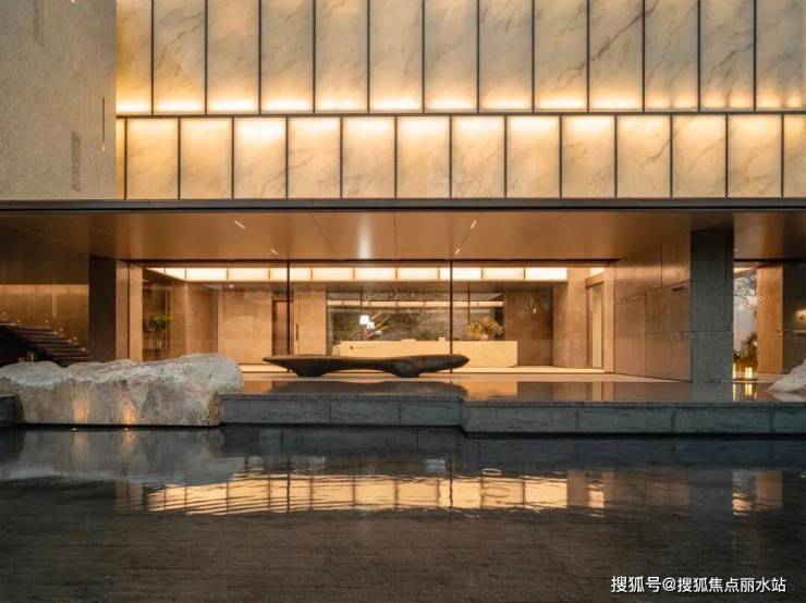 但是这一次屿樾府并没有做气派的大门,而是选择度假酒店的设计,再配上叠水瀑布,大面水景,给业主提供更舒适的归家动线。