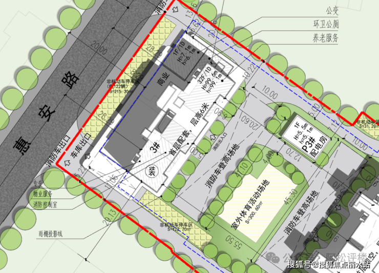 3号楼为1个单元,是连廊结构,32层。3号楼首层为配套用房,包括公厕、养老服务、公变、专变、物业用房、底商等,3号楼预计也是小户型,因此不利因素都扎堆于此。
