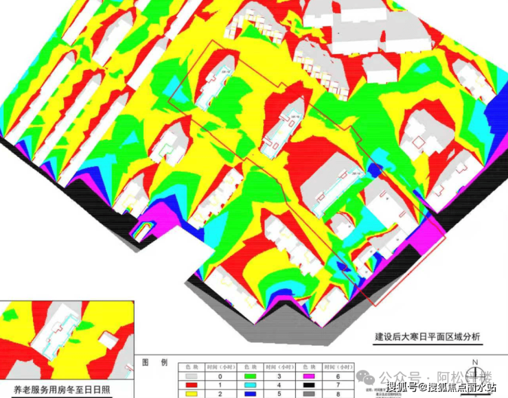 日照图显示,项目1号楼南向临友谊大道,日照不错。大寒日2号楼南向地面附近日照约1-2小时,日照情况并不理想。3号楼南向地面附近日照约3小时,相对会好一些。