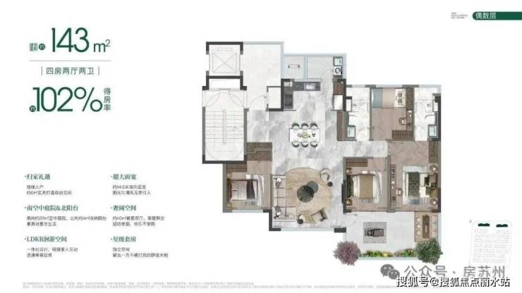 洋房就一个户型,建面约143㎡4房2卫。做到了约14.5米南向面宽+南向约20㎡空中庭院+北向约4㎡收纳阳台+约40㎡餐客双厅…堪称完美的改善户型!