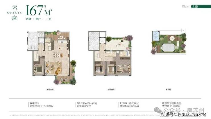 上叠建面约167㎡4房3卫,4房3卫,综合使用率高达约155%,媲美市面上220-310㎡的面宽,而且四房全朝南!