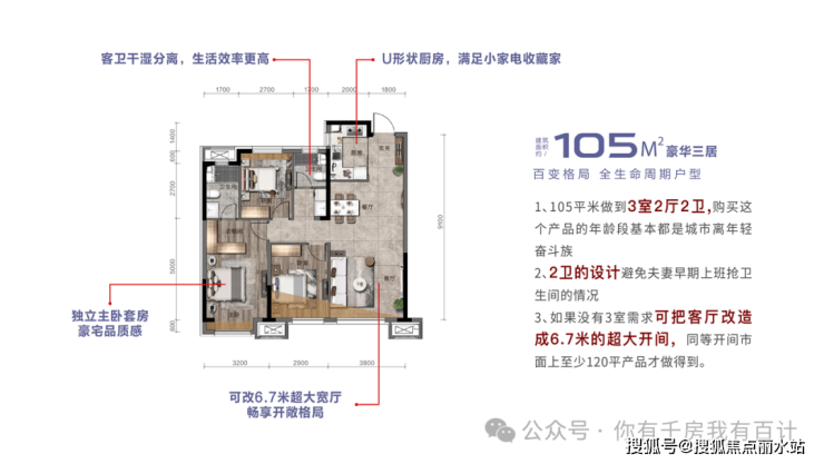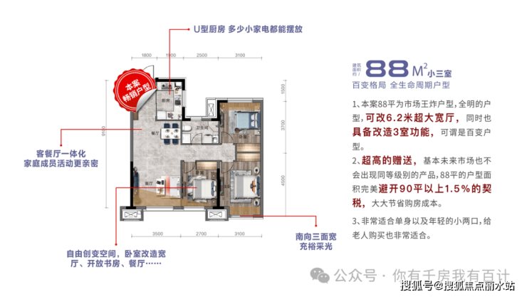 户型佳:88平三房全明户型,客厅可拓至6.2米,堪比市面100平产品;105平标准三室两卫产品,市面120平产品;