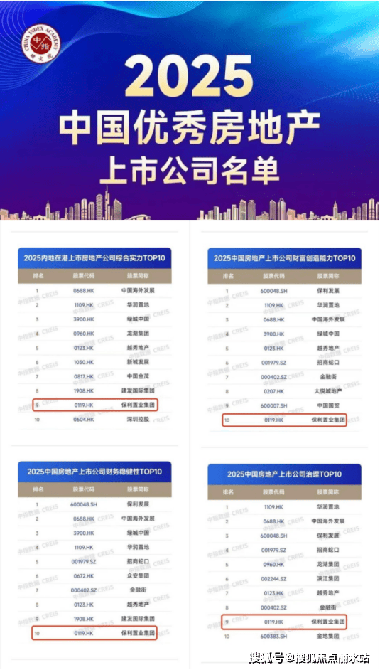 保利置业2025年初荣获中指研究院《2025中国房地产百强企业》TOP20、盈利性TOP10、成长性TOP3、运营效率TOP4;克而瑞“房地产开发企业经营绩效TOP3”等殊荣。