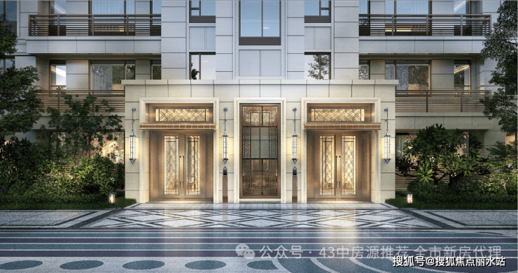 【入户大堂】岩板+金属装饰线条,顶部吊顶与金属装饰结合,高端典雅。打造明亮通透、视野敞阔的入户空间。出则开启自信从容人生,入则拥揽品质温馨生活。