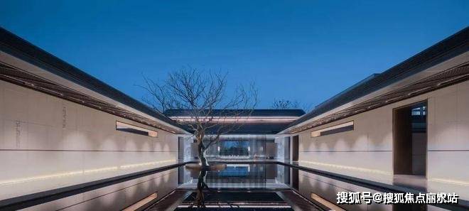 一进·泗水回廊,以镜面水池做基底,精选高大树种置于其中,传承古代造园天人合一理念的同时,打造出中式又不失现代的设计格调。