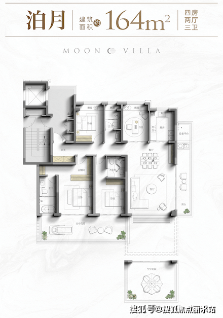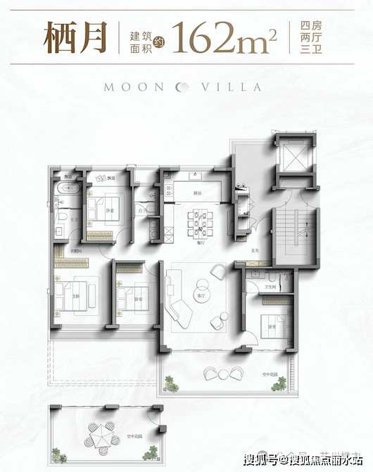 建面约162㎡四代洋房,独立电梯厅,约21㎡空中花园,约14.9米面宽,南向双套房。