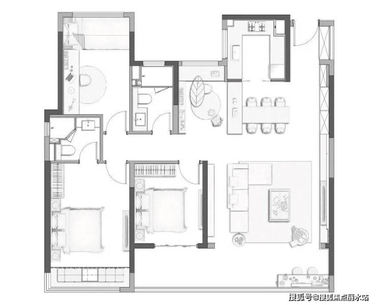 整体定位改善,设置118㎡、136㎡三房的3梯4户和137㎡、143㎡四房的2梯2户户型,以70%空间设计加上30%高定空间理念,打造高定人居体验。