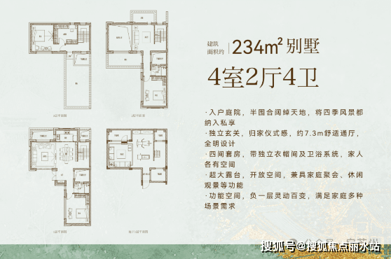 有天有地有院子有露台,赠送面积很大!以234㎡合院户型为例:约44㎡私家花园+约51㎡露台+约18㎡挑空+5.4米挑高地下室+其他可拓展空间,整体赠送面积超163㎡。