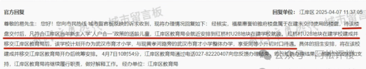 并且城市留言板已明确回复,这所学校与育才一小本校整体办学,享受同等小升初待遇,福星惠誉·铂雅府交付后将就近划片至育才小学。中译中一下就是,这所学校是育才小学本校、对口武汉六初、福星惠誉·铂雅府交付后可对口。