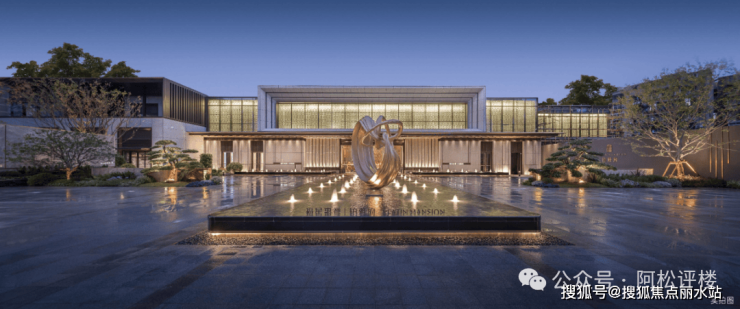 高奢酒店式归家入口:长约20米的瑰丽奢石景墙阵列迎宾,艺术雕塑与灵感喷泉点缀其中更显相得益彰。