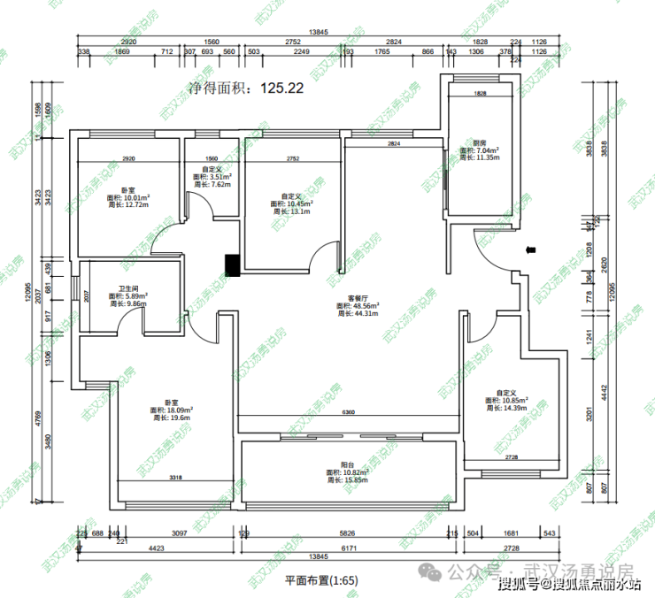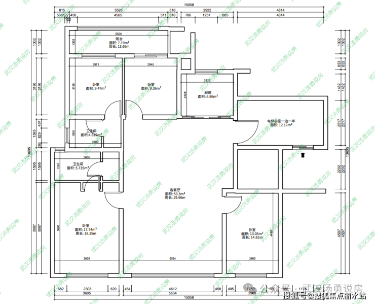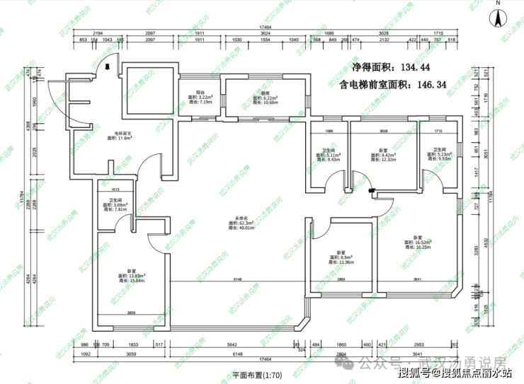 我这个带尺寸的户型图和开发商的给的尺寸有点不一样,这个是去除了墙体的实得面积,开发商口径的得房率的口径包含墙体面积,我这个是净得面积,是直接拿来装修用的,客餐厅:50.3,主卧:17.74,父母房:13.05,北卧1:9.47,北卧2:9.36,主卫:5.735,客卫:4.625,北阳台:7.19,厨房:6.86,电梯前室6平左右。