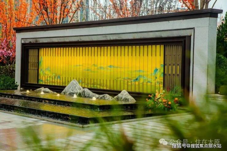 中央区域,一湾清浅水景如舒展的叶片静卧其间,与两侧绿植相映成趣,为庄重的入口注入一抹灵动的自然气息。而深色石材与金属框架构成的景墙,则通过材质的碰撞,在细节处无声诠释着“雅”的韵味与“颂”的秩序。