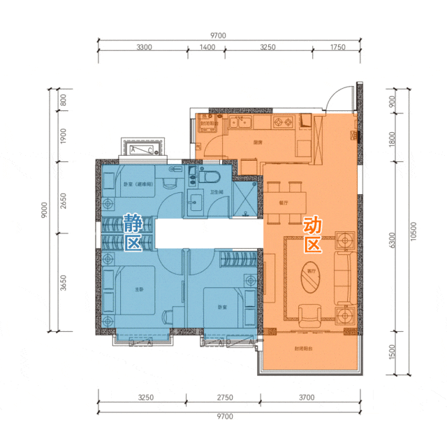 户型采用动静分离布局,将客厅、餐厅等动区与卧室静区清晰划分,确保家庭成员的活动与休憩互不干扰。