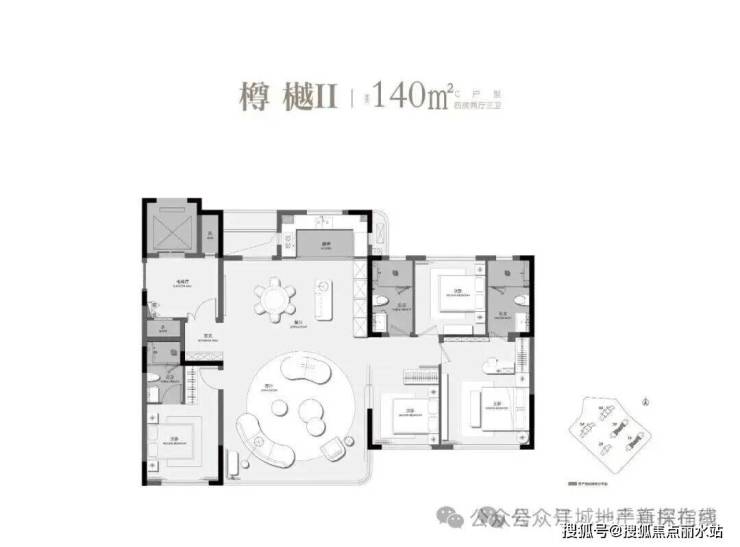 建面约119平的边套则做成标准四房+大横厅,足以秒杀周边建面约140平传统户型。