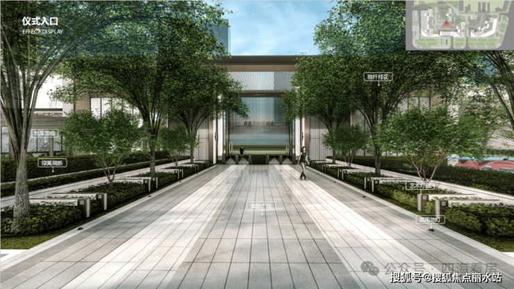园林主轴:两侧桂花树恭迎业主归家,漫步在集散广场上,路旁的艺术灯箱及地灯照明回家的路途。