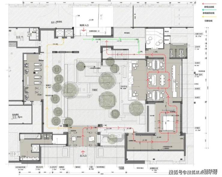 展示中心内部参观动线主入口位于南侧,在销售期向右形成景观通廊、展示区、水吧、洽谈区、儿童区、入户等序列体验动线;交付后左侧盒子改为健身区,大堂改为门禁制,完善服务配套同时,也保障社区内安全。