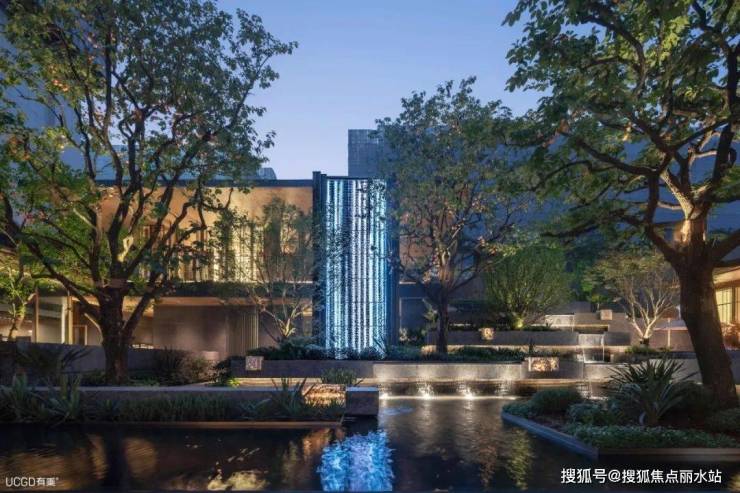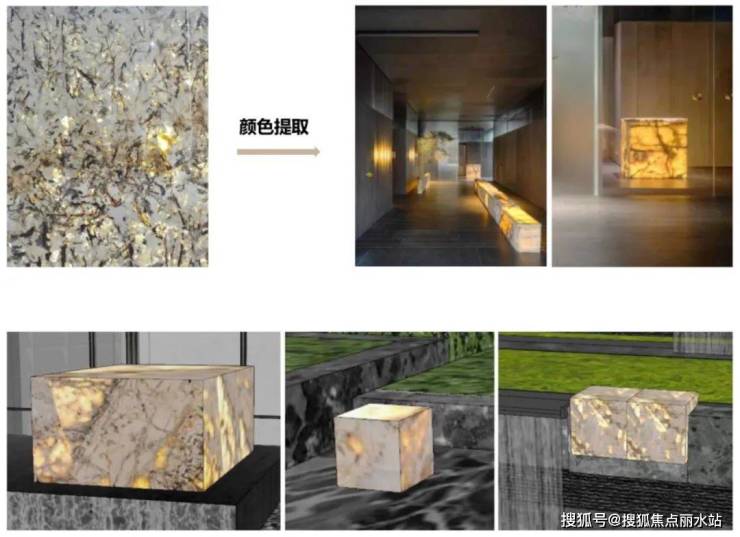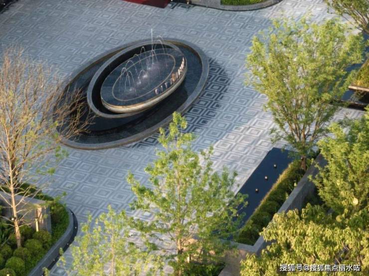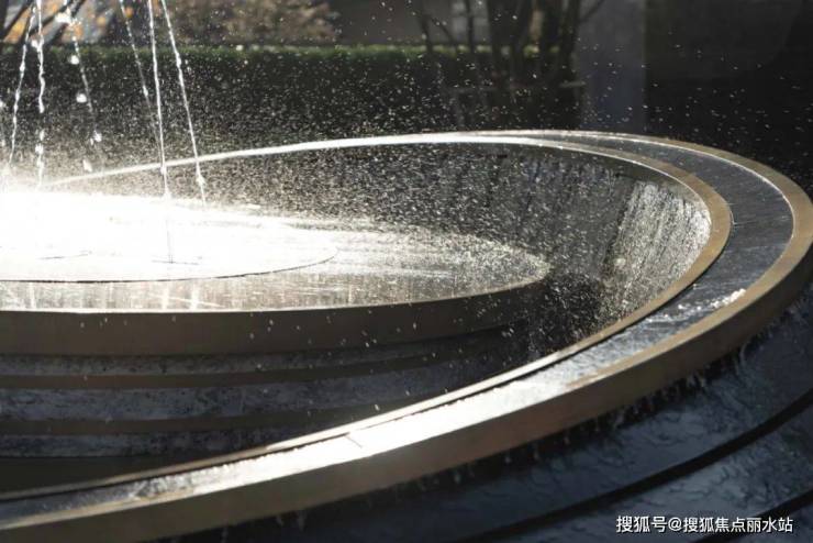 地面铺装采用玉纹衍生的回字式样,雕塑造型为玉环相扣、玉盘落珠,在潺潺水声中流露出萃玉风雅与美好祝愿。