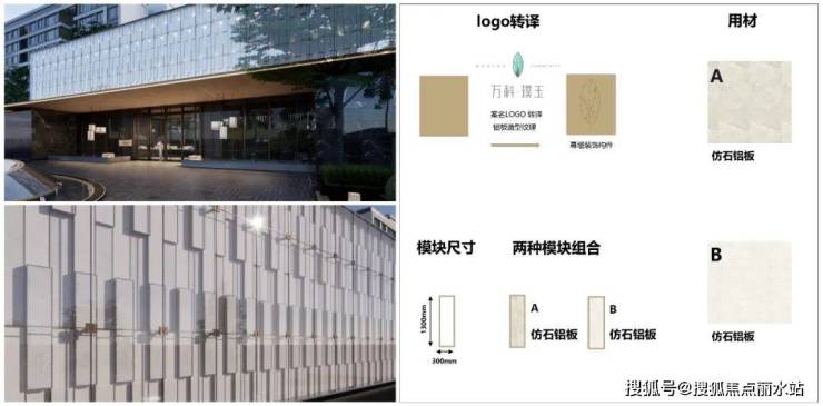 立面幕墙装饰构件,由案名LOGO转译成铝板造型纹理,整体几何形态以“玉章”为原型,选取两种仿石铝板模块组合,精准拿捏其比例与节奏韵律,创造“淡妆相宜”的建筑美学。