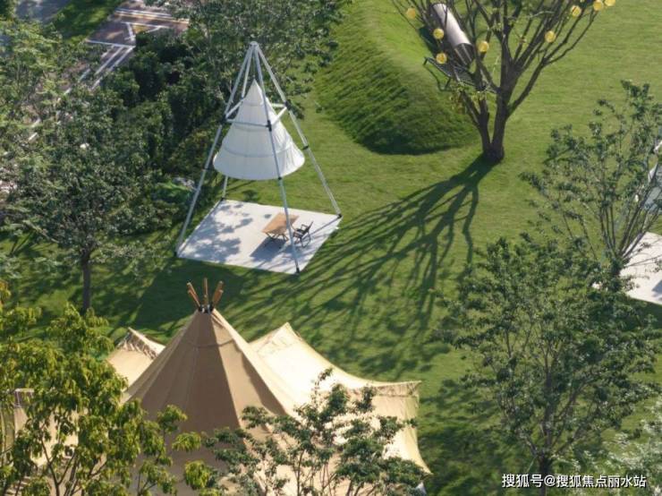 沿街商业对面,是一片开阔静谧的阳光大草坪,利用高差做出微地形,放置可供休憩玩耍的户外家具器械,日常供居民露营遛娃,周末或者节庆日可提供集市、表演和展览的拓展支持,满足社区全龄层多元化的兴趣爱好和感官体验。