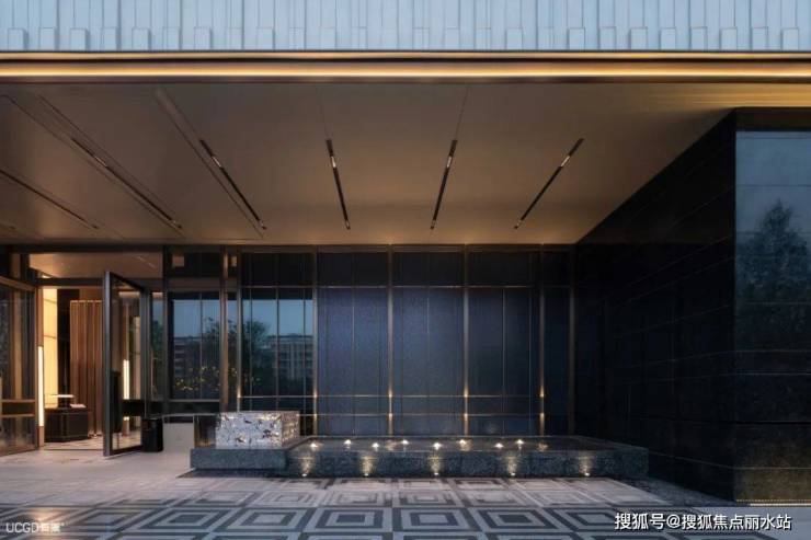 单元入户门头采用大尺度挑檐设计,墙面色泽深沉而典雅,搭配泛光灯具,精工品质将仪式感一路铺陈。
