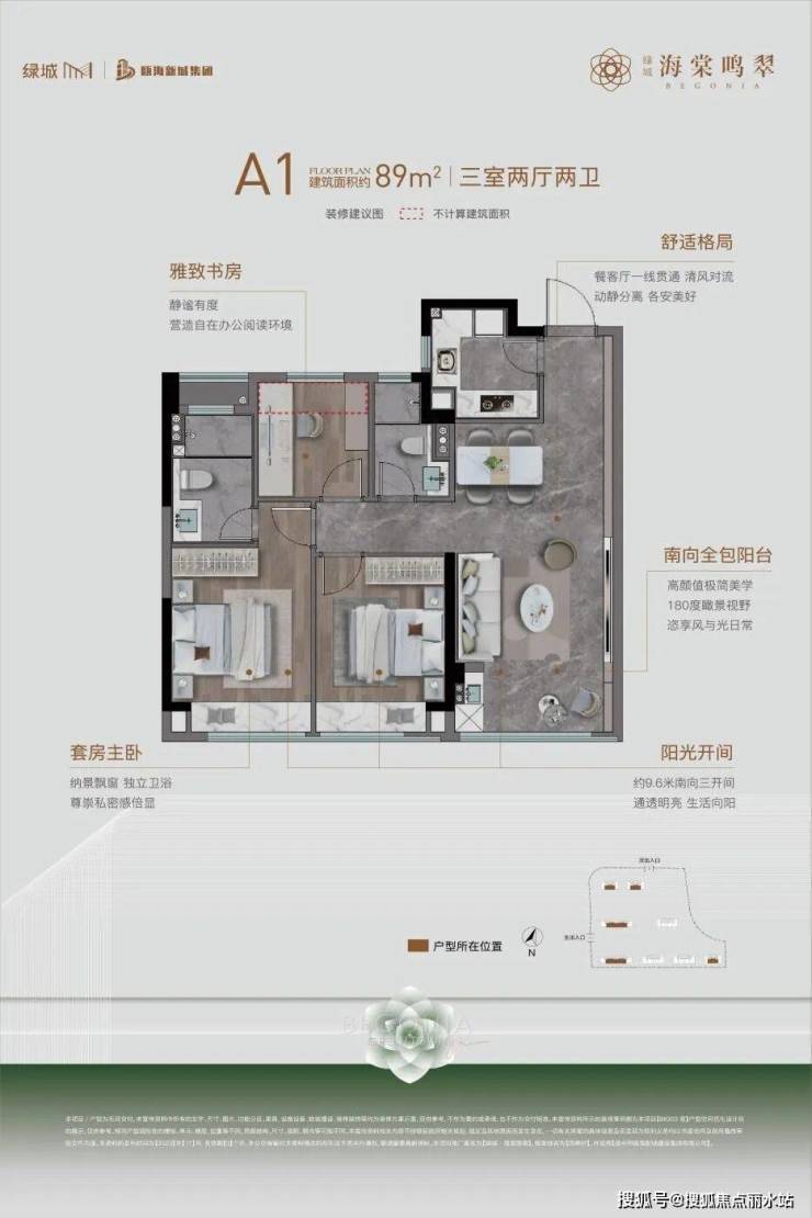 以建面约89㎡户型为例,动静分区式设计,有效保障业主的私密性。南向全包阳台,既统一了立面平整性,又有效隔绝外界噪音干扰;以及带来180°瞰景视野的视觉盛宴。