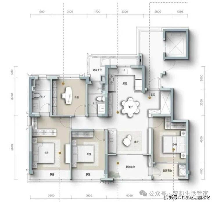 这里主卧没有做转角窗,面宽也做到3.6m,而且侧面留了一个小窗采光,设计做的很务实,方便根据业主按自己需求来布置。我始终认为,如果不是窗外有特殊的景观条件,转角窗视野作用不大,很大程度会制约主卧的布置。