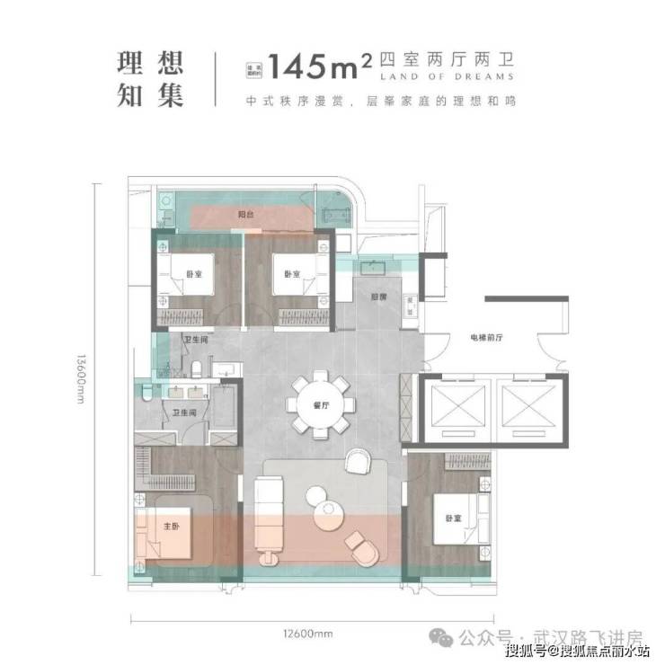 ①145㎡户型,四室两厅两卫,户型方正实用且三开间朝南,电梯前厅入户提升居住质感。值得一提的是南北双阳台设计,这在四代住宅中并不常见,实用性与舒适度双在线。