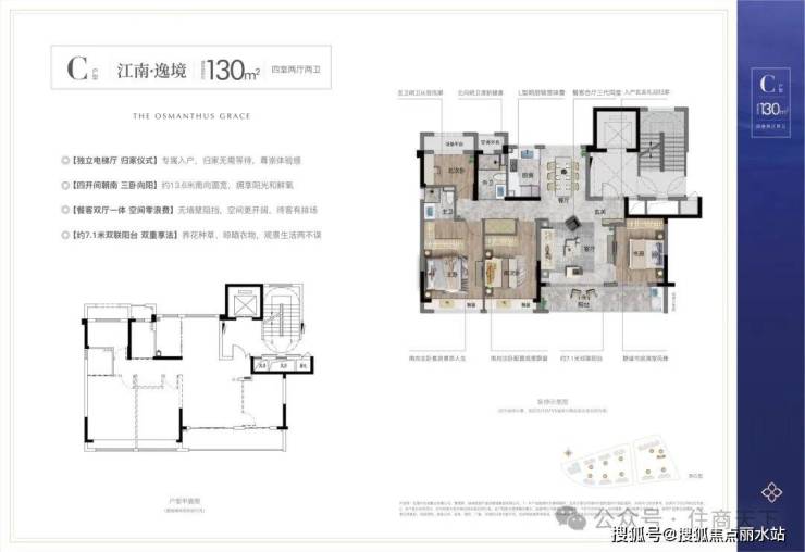 130㎡户型:独立电梯厅,私密入户,四开间朝南
