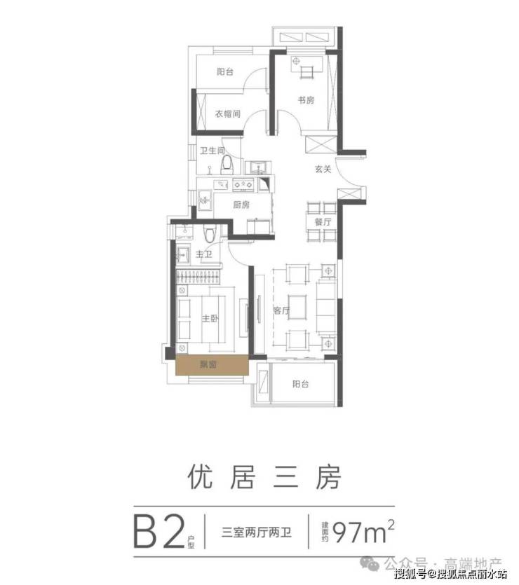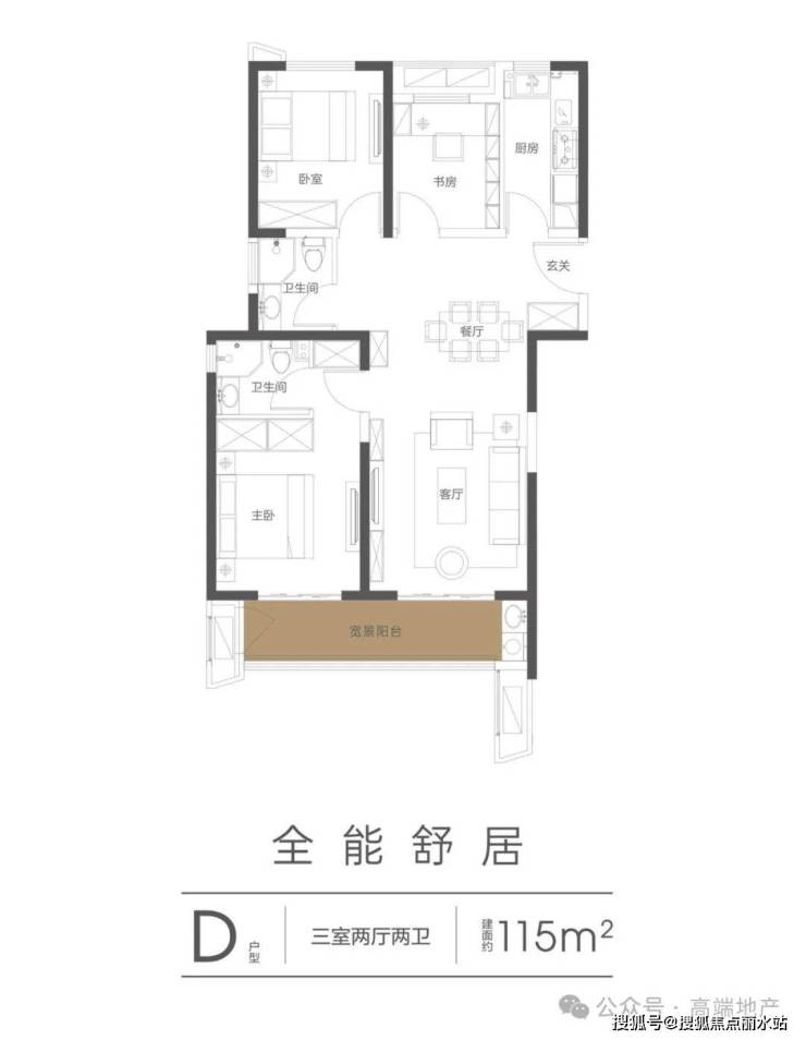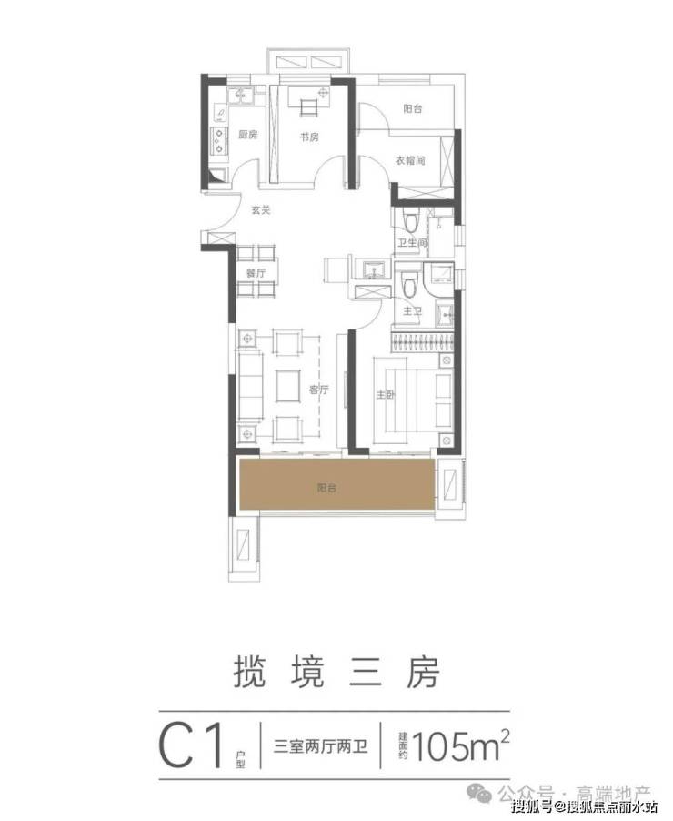 106㎡户型南向6.5米超大观景阳台,两卫设计,媲美120㎡户型空间。