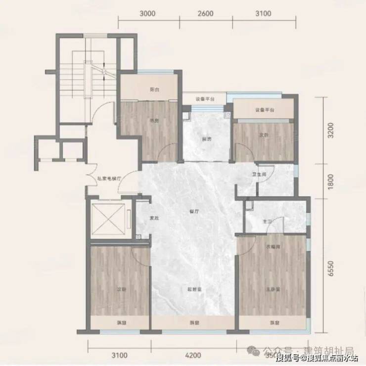 158户型相比的126户型大格局基本一致,就是客厅是5.5米宽厅了。电梯贯通梯,多了私家电梯厅和入户玄关,归家更私密,仪式感更强了。电梯厅还是个暗厅,要是明厅就好了。