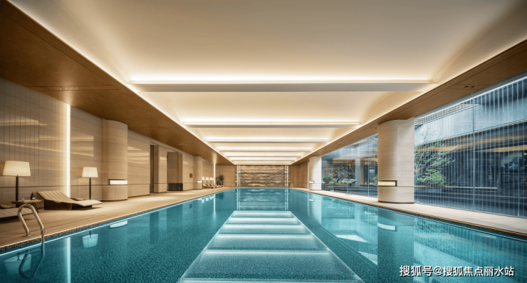 会所内部以意大利库里灰石材铺装楼梯台阶地面,以塞尔维亚宝格丽白石材修饰墙。酒廊主背景选用挪威银河黑奢石,局部融入巴西绿色奢石主题色。私宴厅则以紫山水大理石为空间点缀,搭配米白色荔枝皮革营造艺术氛围。泳池区域采用浅色系爱丽丝木纹大理石墙面,北侧点缀维多利亚绿奢石,池底铺设冰瓷玉马赛克,流光溢彩。