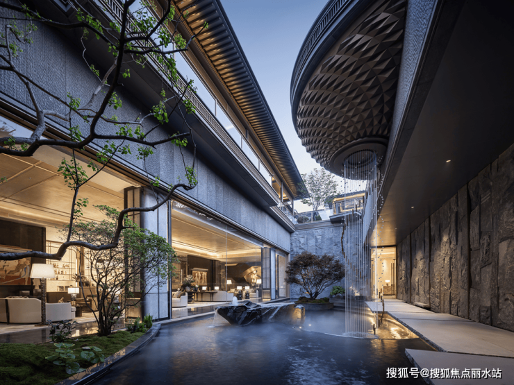会所入口处,遵循适地适树的自然法则,通过全冠移植技术,引入进口原生羽毛枫、黑松以及高约7.5米、树龄150余年的罗汉松,红枫柔美、古松苍劲,相映成趣。来自太行山脉的中国黑自然石皮,以天生自然的古朴厚重,在下沉式水庭中构筑起虚实相生的水墨画卷。