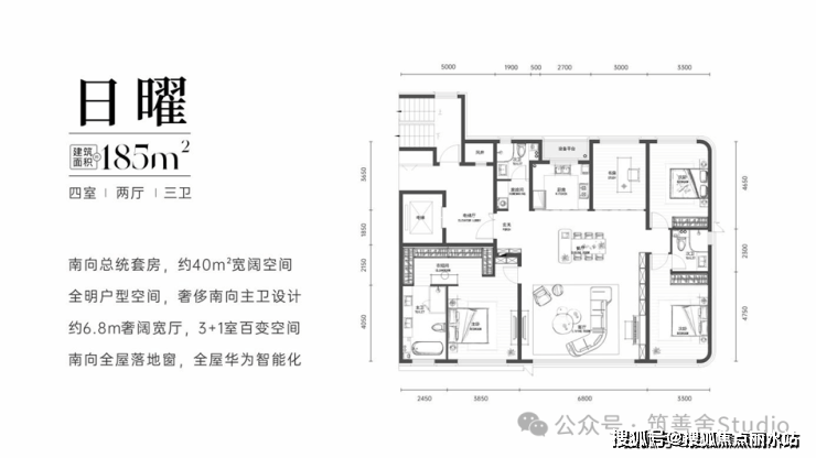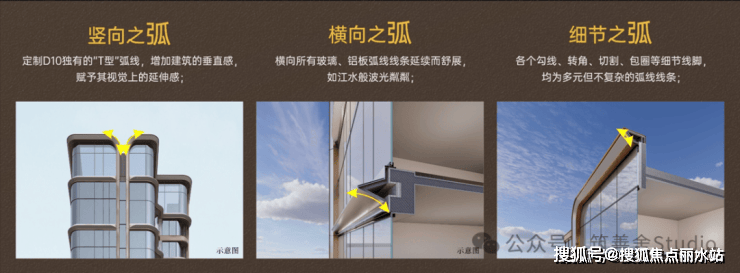 以豪宅立面划定身份,D10天誉摒弃了传统立面的“棱角分明”,遵循斐波那契螺旋系数,以无限的美和艺术,形成了一整套的曲线外立面体系。曲线大胆流畅而且随性,塑造出种难以想象的未来感,整体外观看上去更加圆润柔美,在高楼林立的城市中脱颖而出,将D10和其他住宅区分开来。并打破了市面上常规的门窗分隔,大比重选用玻璃+铝板线条,将视觉界面拓展到「270°全画幅」,使室外景观以超广视角进入室内空间,打造“天空客厅”般的感受。