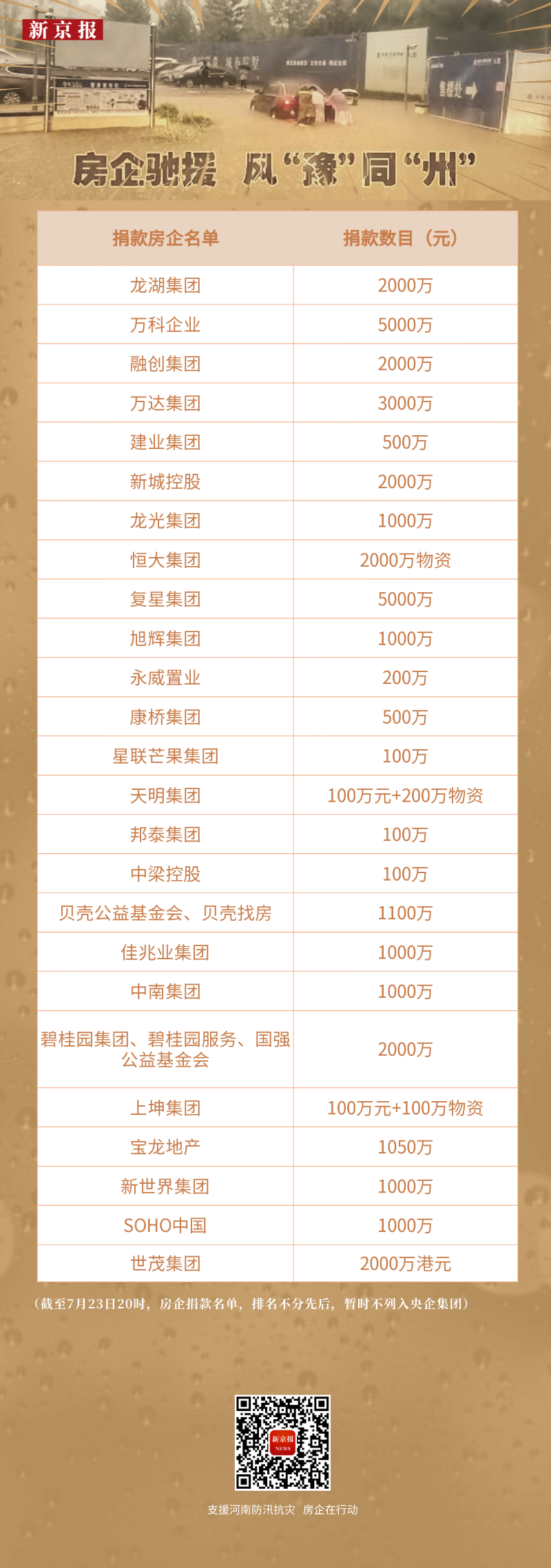 据新京报记者统计,截至7月23日20时,已经有包括万科、龙湖集团、恒大集团、碧桂园、万达集团、新城控股等25家房企公开宣布捐款,共计捐赠资金达到约3.48亿元。此外,还有恒大集团、天明集团、上坤集团、绿地集团等房企捐赠物资。