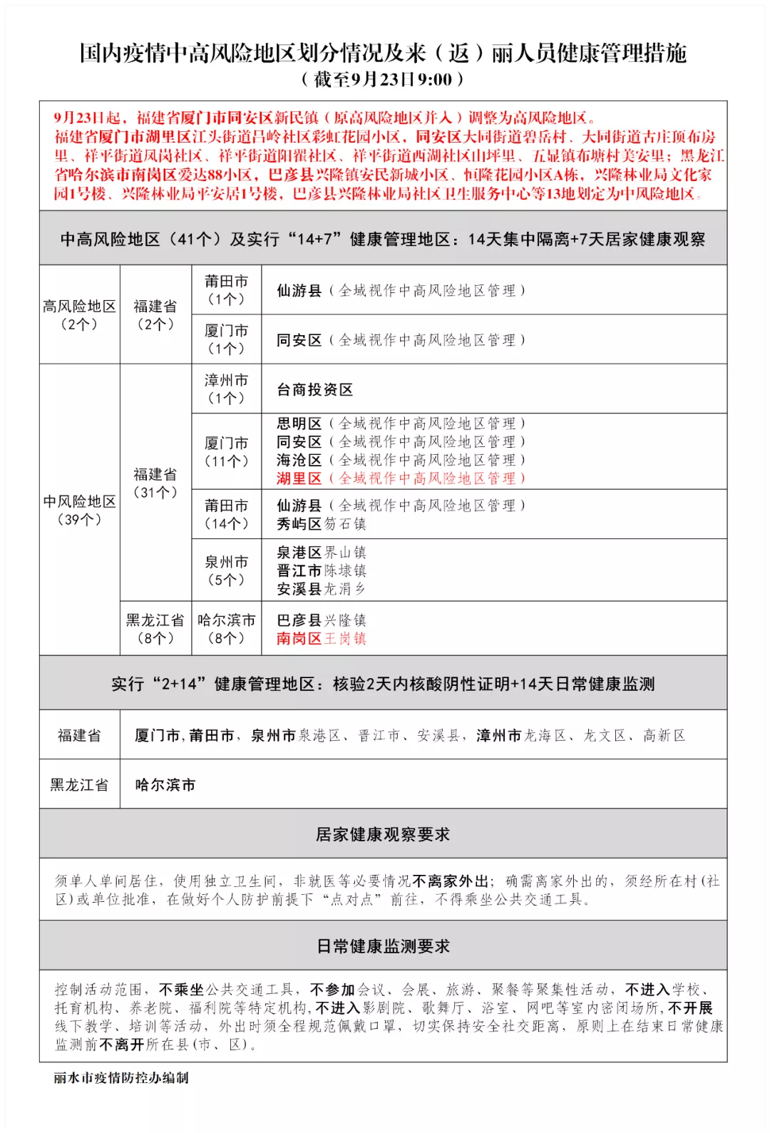 今天上午,市疫情防控办更新了国内疫情中高风险地区划分情况及来(返)丽人员健康管理措施。