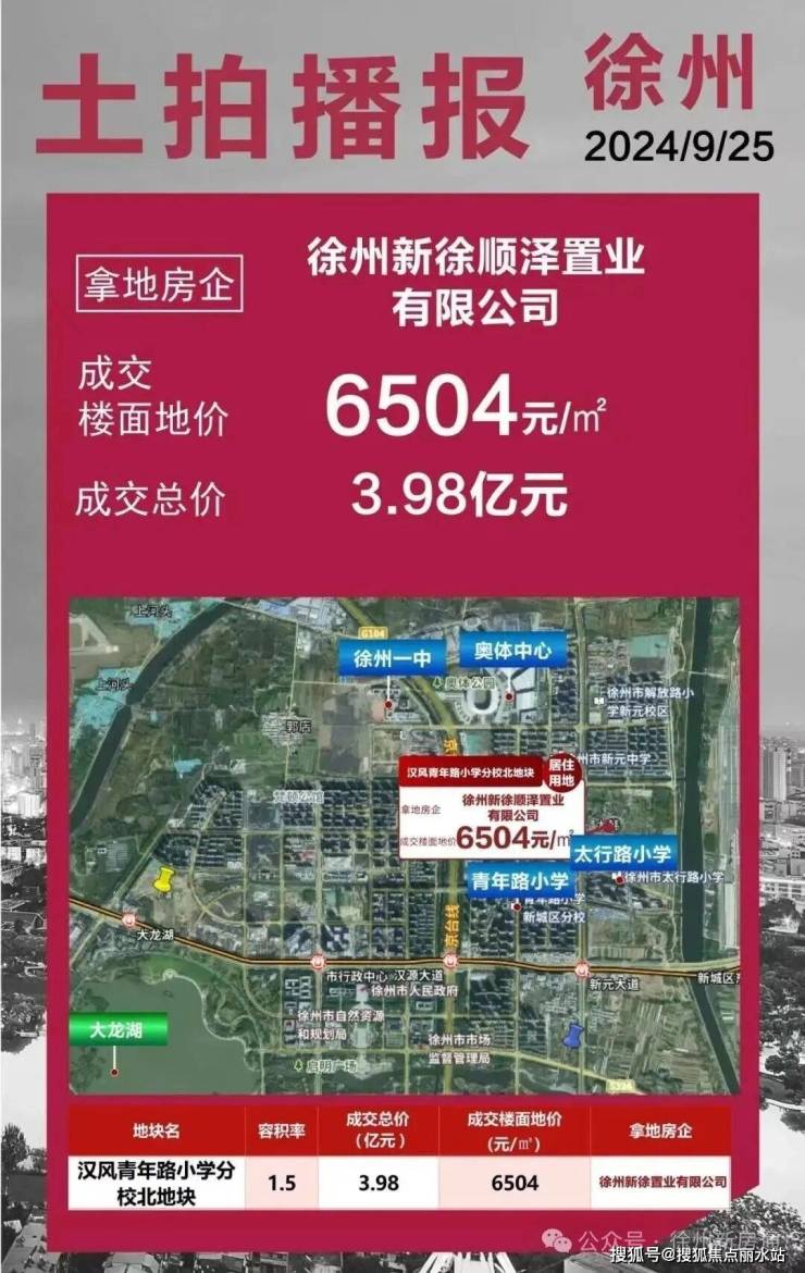 根据标示位置,该小区就是2024-22号汉风青年路小学分校北地块项目。2024年9月25日被徐州新徐顺泽置业有限公司(徐州交控旗下),以39800万元摘得,成交楼面价6504元/㎡。