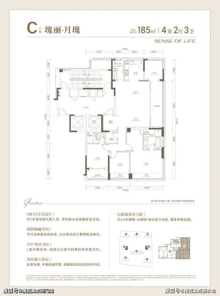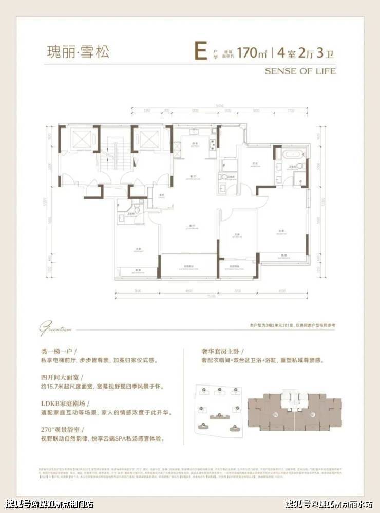 建面约170方户型实现“主卧小家化”, 奢华套房式主卧,奢配衣帽间+双台盆卫浴+浴缸,同时配有大飘窗,采光和景观面不输大客厅。