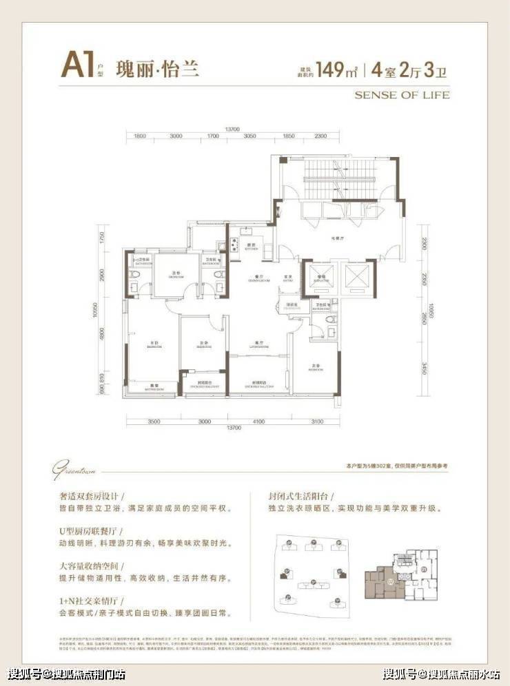 加上南向 约13.7米的超大面宽,尺度感比市面上多数160方户型还要阔绰。