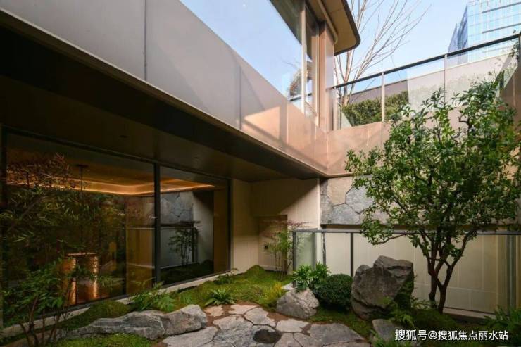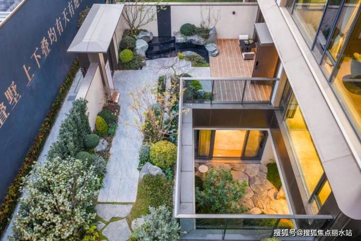 又如下叠“气场全开”的私家庭院——奢阔的空间尺度足以媲美合院级别,不仅是南向的超大院子,甚至北面与侧面,也有院落空间互相打通,形成270°环绕式庭院。